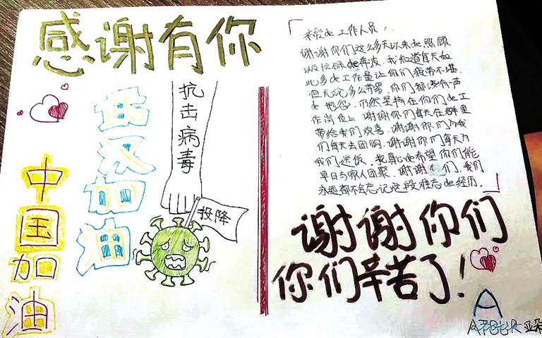 臨走時(shí),小涵留下一封感謝信,上面用彩筆寫著“感謝有你”“中國加油”“武漢加油”,下面還畫了一幅病毒投降的圖畫。她在信中說:“謝謝你們這么多天以來的照顧以及奔波,我知道每天如此多的工作量讓你們疲勞不堪,但無論多么勞累,你們都沒有一聲抱怨,仍然堅(jiān)持在自己的工作崗位上。謝謝你們每天在群里帶給我們歡喜,謝謝你們每天為我們送飯。我真心希望你們能與家人團(tuán)聚,謝謝你們,我永遠(yuǎn)都不會(huì)忘記這段難忘的經(jīng)歷?!保ㄎ摹z影/北方新報(bào)正北方網(wǎng)記者張巧珍)