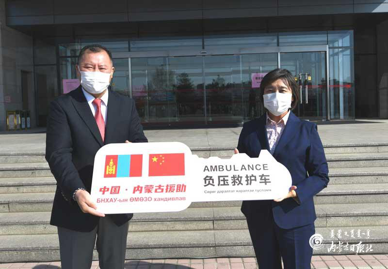 4月10日上午,中國內(nèi)蒙古自治區(qū)人民政府向蒙古國烏蘭巴托市捐贈醫(yī)療物資暨 “一帶一路?光明行”蒙古國行動捐助儀式在呼和浩特舉行。內(nèi)蒙古自治區(qū)主席、紅十字會名譽(yù)會長布小林出席活動,并向蒙古國駐呼和浩特總領(lǐng)事館移交捐贈的負(fù)壓救護(hù)車鑰匙。內(nèi)蒙古日報社融媒體記者 韓卿立 攝