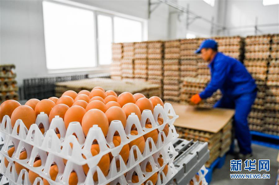 內(nèi)蒙古烏蘭察布市卓資縣十八臺(tái)鎮(zhèn)村民在當(dāng)?shù)亟痣u產(chǎn)業(yè)園區(qū)廠房?jī)?nèi)分揀雞蛋(2020年3月26日攝)。新華社記者 連振 攝