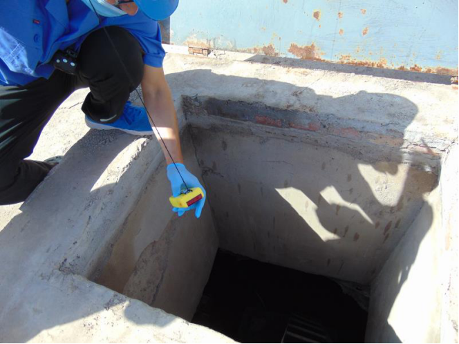五、采樣。到達(dá)采樣地點(diǎn),由采樣員王連柱、葛帥按規(guī)定將井蓋打開(kāi),通風(fēng)5分鐘,使用空氣檢測(cè)儀對(duì)井下空氣進(jìn)行測(cè)量,無(wú)異常后,佩戴安全帽,進(jìn)入井內(nèi),連接水管排水20分鐘后按要求進(jìn)行采樣。