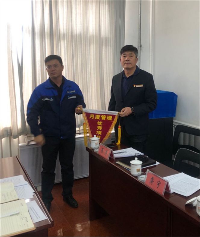 城建公司副總經(jīng)理龔宇為第二名頒發(fā)《月度管理優(yōu)秀項(xiàng)目部》榮譽(yù)稱號(hào)(圖左城建公司副總經(jīng)理吳?。粓D右項(xiàng)目經(jīng)理付文寧)