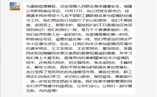 城建公司黨支部對本次在疫情防控值守中挺身而出、沖鋒在前的志愿者同志進(jìn)行表揚(yáng),并號召全體黨員向他們學(xué)習(xí),牢記初心使命,踔厲奮發(fā)、勇毅前行,進(jìn)一步夯實黨支部戰(zhàn)斗堡壘。