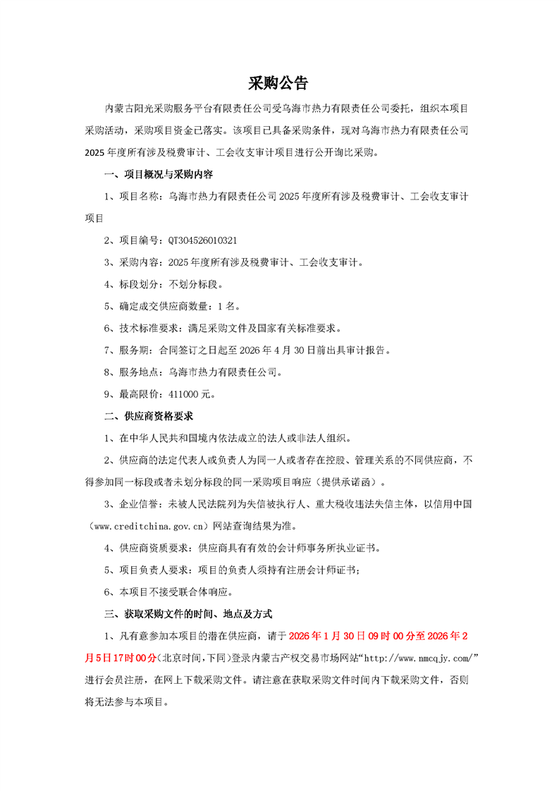 - 2026-03-112026年烏海市澤匯園林綠化工程有限公司管材采購項目比選采購公告